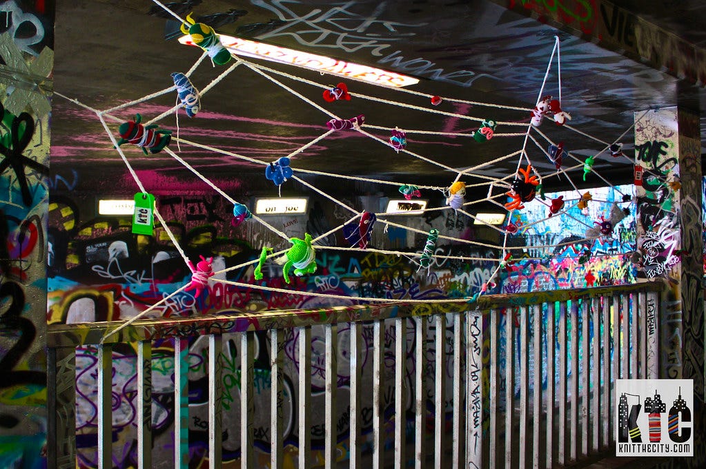 Gardens are also attached to infrastructure like walls, fences, benches, buildings, and other human-made systems that can become composed with the garden through expressions of art. We envision collective forms of art like graffiti to naturally become a decorative aspect of these gardens. Examples like graffiti knitting or yarnstorming or yarnbombing or guerrilla knitting is the art of using items handmade from yarn to create street art.