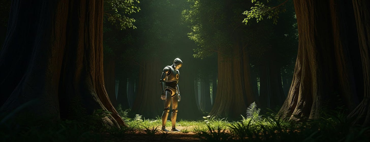 The Embodiment of a Question: Perhaps the robot's true function is entirely for its creators—a philosophical act. Sending it into the untamed past becomes a symbolic gesture, a monument to humanity's own search for meaning, our curiosity about origins, and our complex relationship with the universe. The robot itself performs no "task" in the forest that benefits us, but its journey embodies our deepest inquiries.